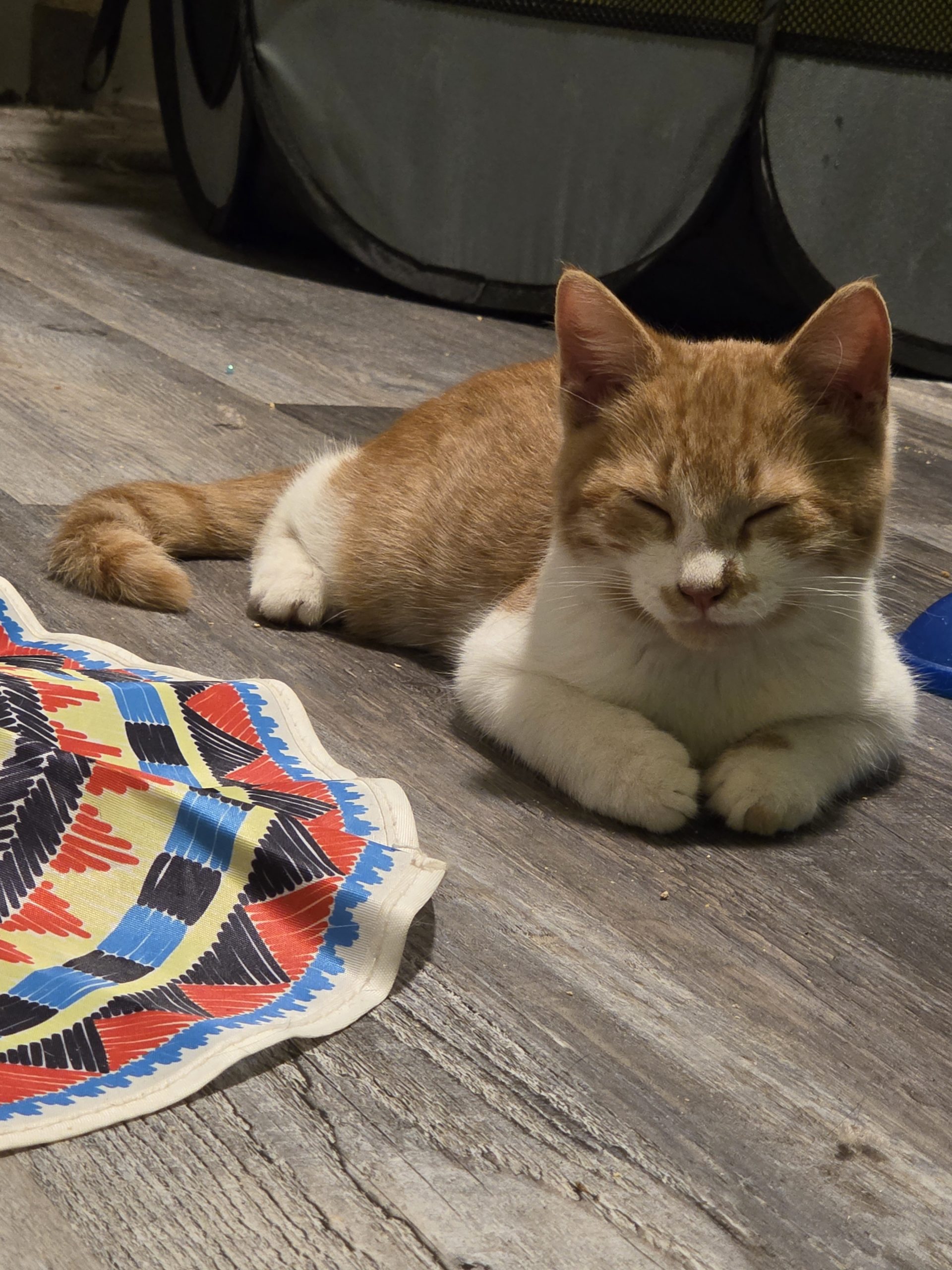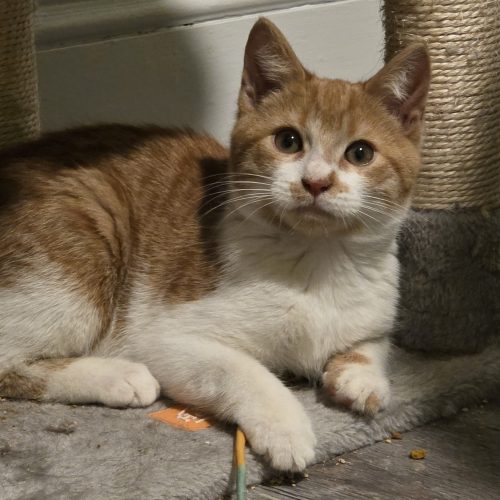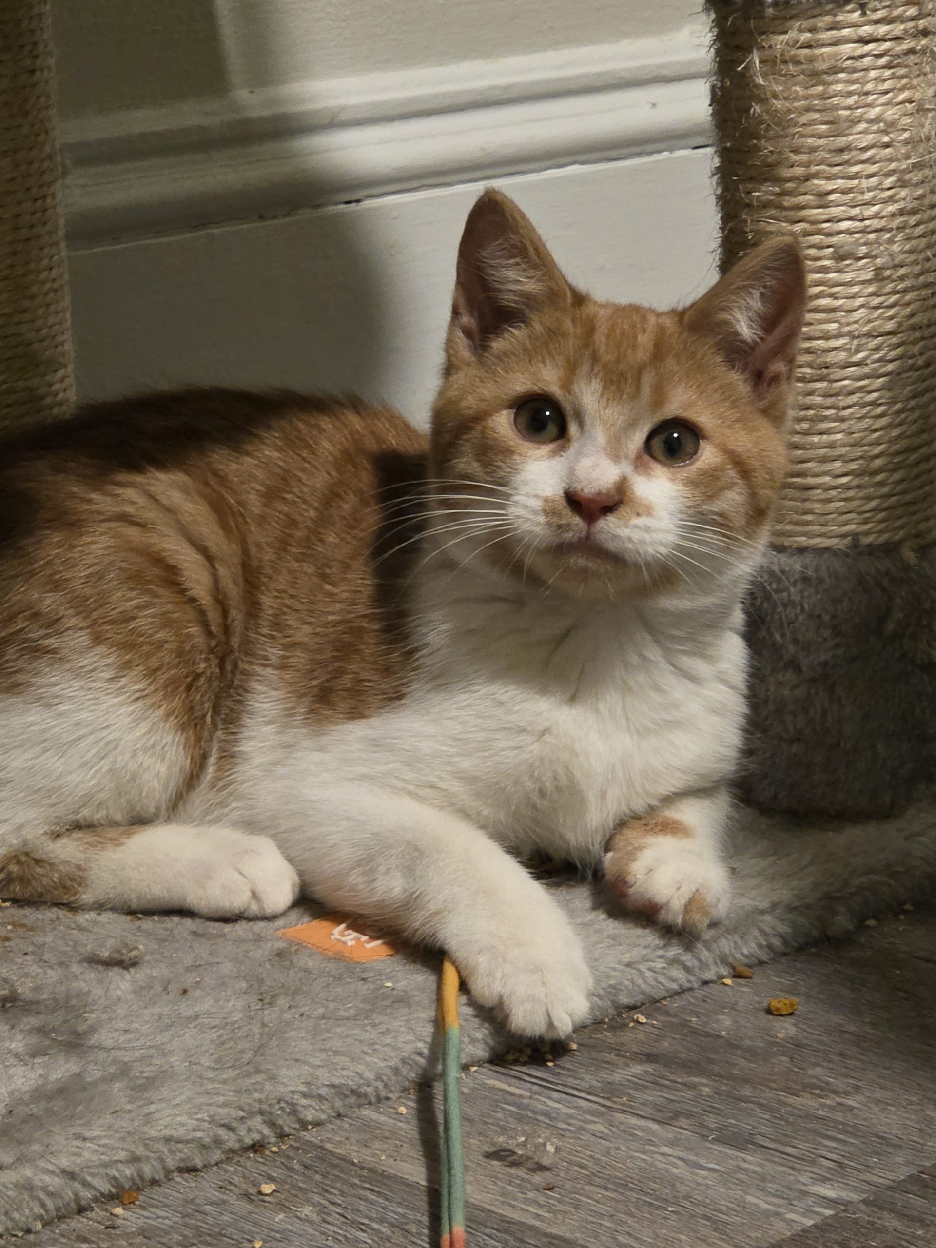 Derek eats IAMS Healthy Kitten kibble as an all day graze, with ½ can Fancy Feast wet 2x daily. He LOVES Churu treats! He loves all kinds of toys, but especially enjoys interactive ones. He will thrive most in a house with another cat to share a bond with. The most adorable thing about him is his chirpies that he makes when playing, eating, and getting pets!