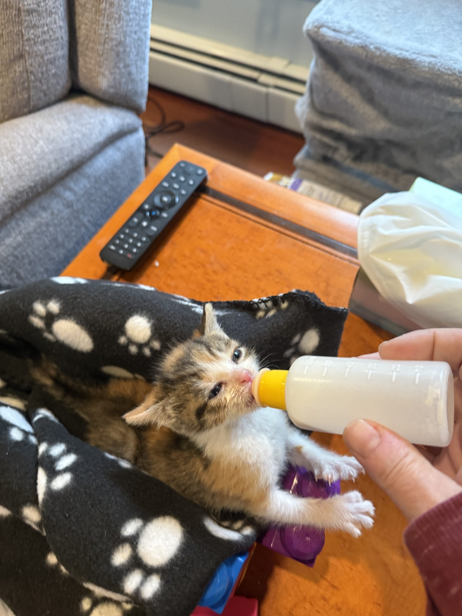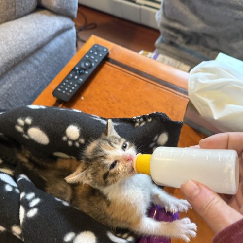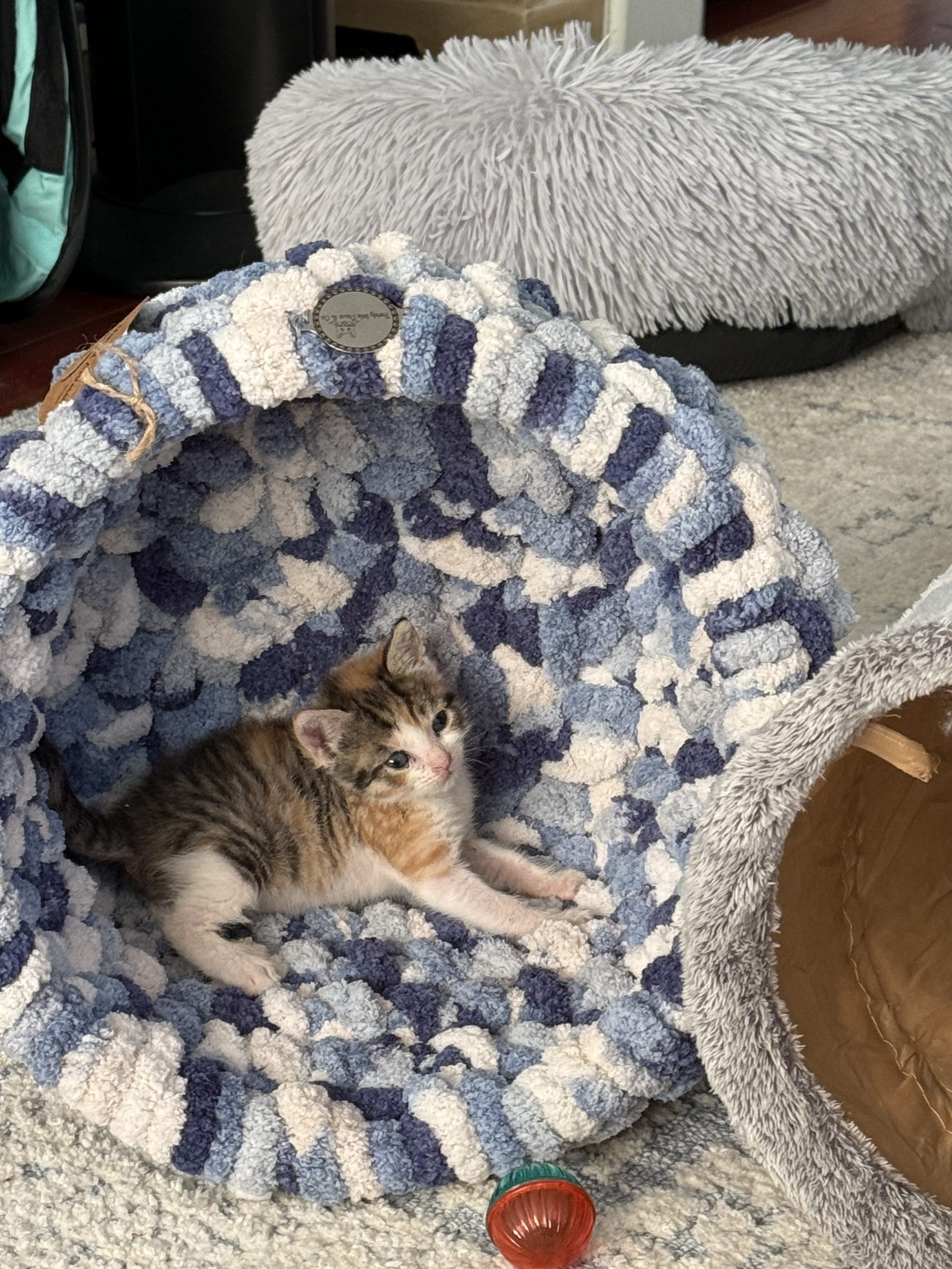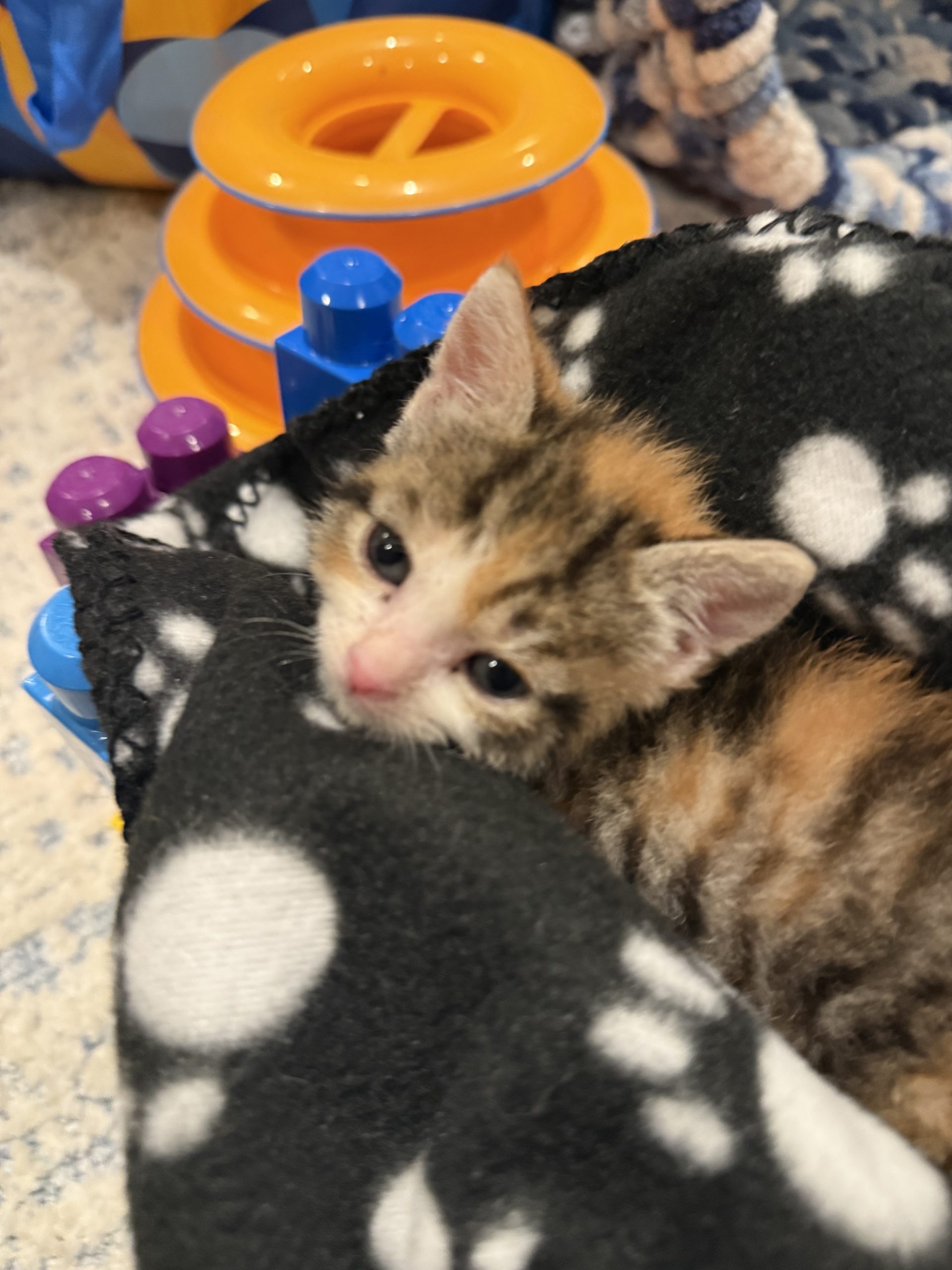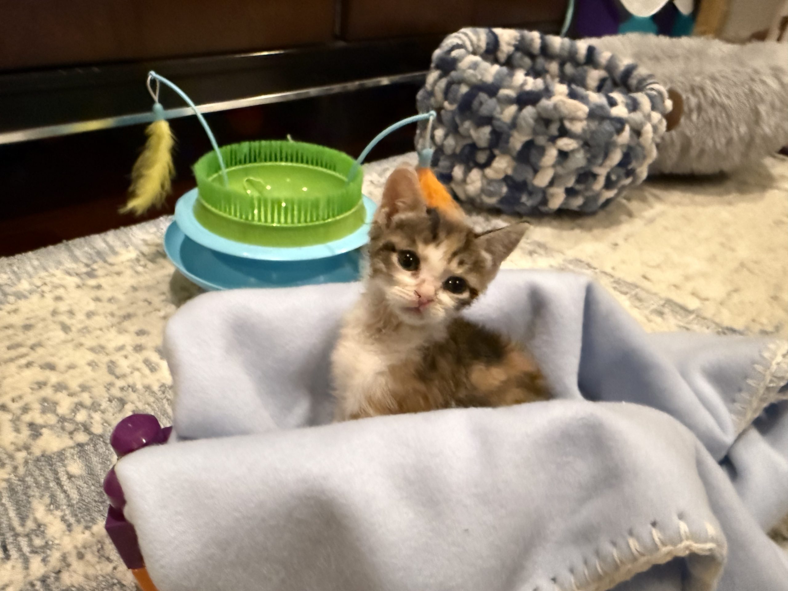 Elsa use the litter box regularly, and although she struggles a bit to get in, but she hasn’t had any accidents! She enters and exits the litter box independently. Elsa currently eats Royal Canin Mother/Baby Wet food, as she is still in the process of becoming the big girl that she is. Elsa loves to play with Jingle bell balls, and she also enjoys crawling through the crinkle tunnels in her foster placement. For Elsa, she also plays with her exercises to increase her strength and agility. Her amazing foster mom, our rescue nurse/bottle feeder, is using counter-pressure on her back paws to help strengthen them. Elsa also benefits from some stretching exercises over the tunnel or rolled up blankets. Her foster helps her efforts to walk by providing support on her sides to prevent her from falling over.