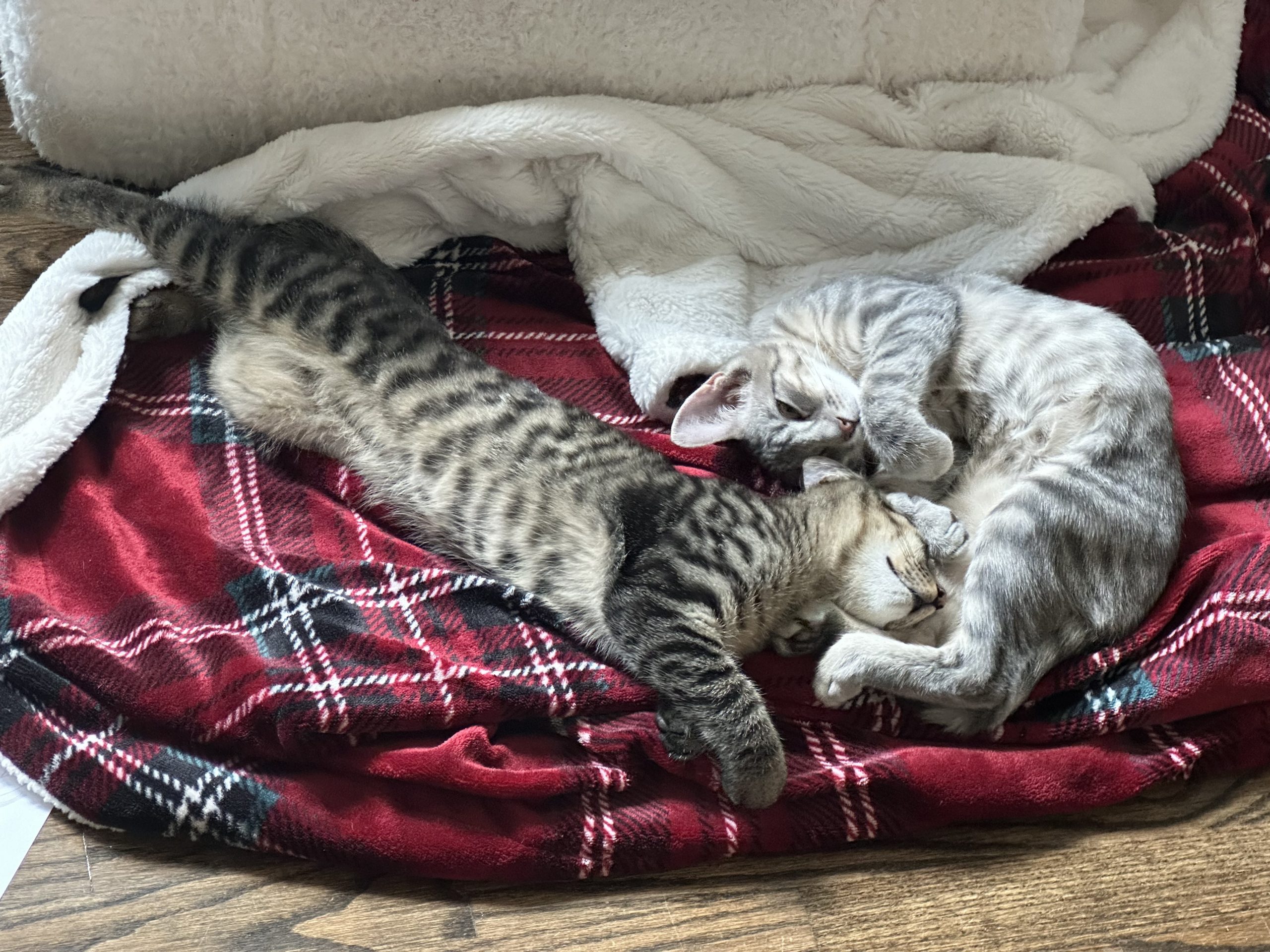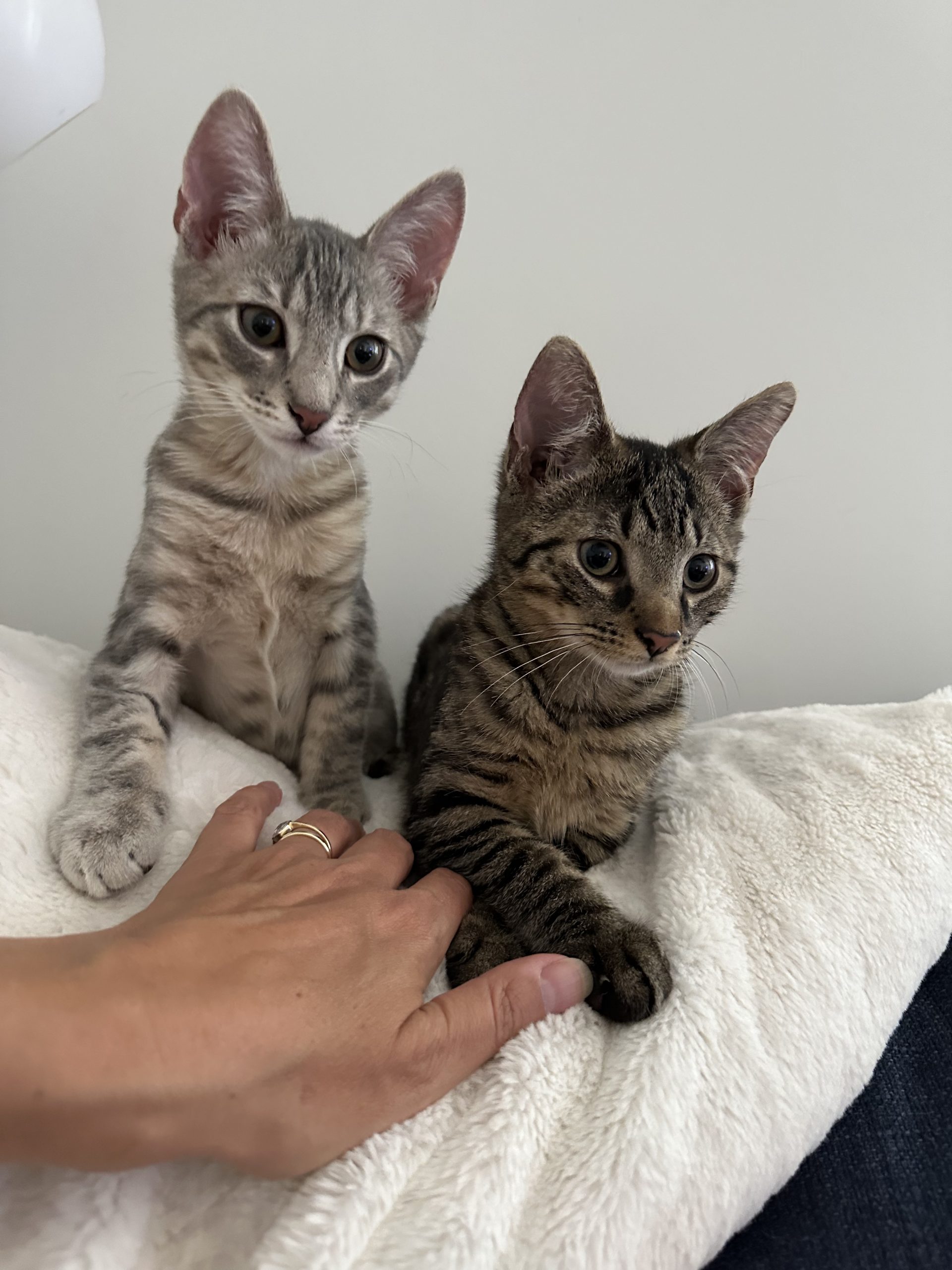 These boys are the purrfect combo of playtime warriors and cuddle champions. One minute they’re racing through imaginary obstacle courses and launching sneak attacks on toy mice, the next they’re flopped in your lap, snuggling up and purring like tiny engines. And yes – they snuggle HARD. These two will actually compete for prime snuggle real estate – your arms, your lap, anywhere they can get cosy!