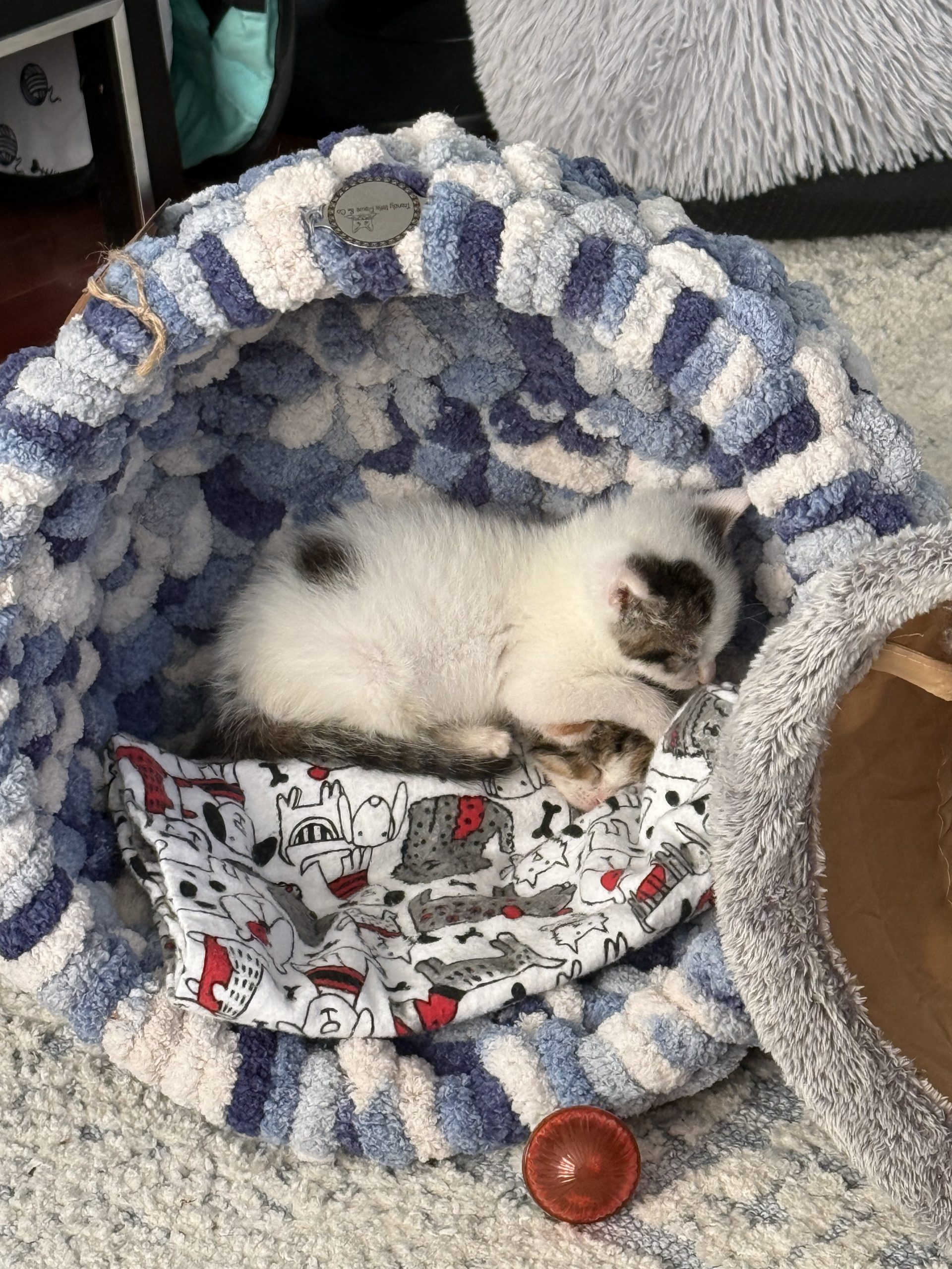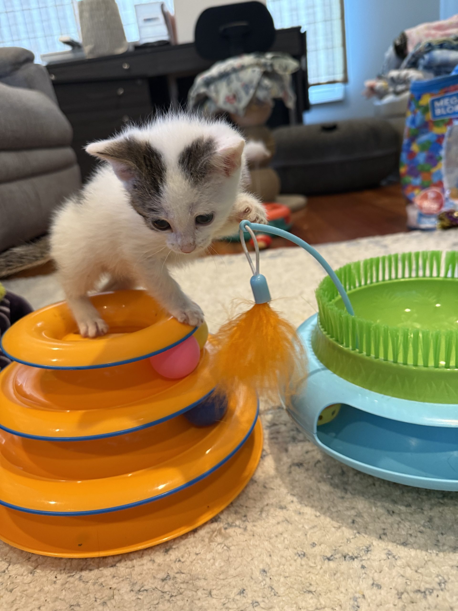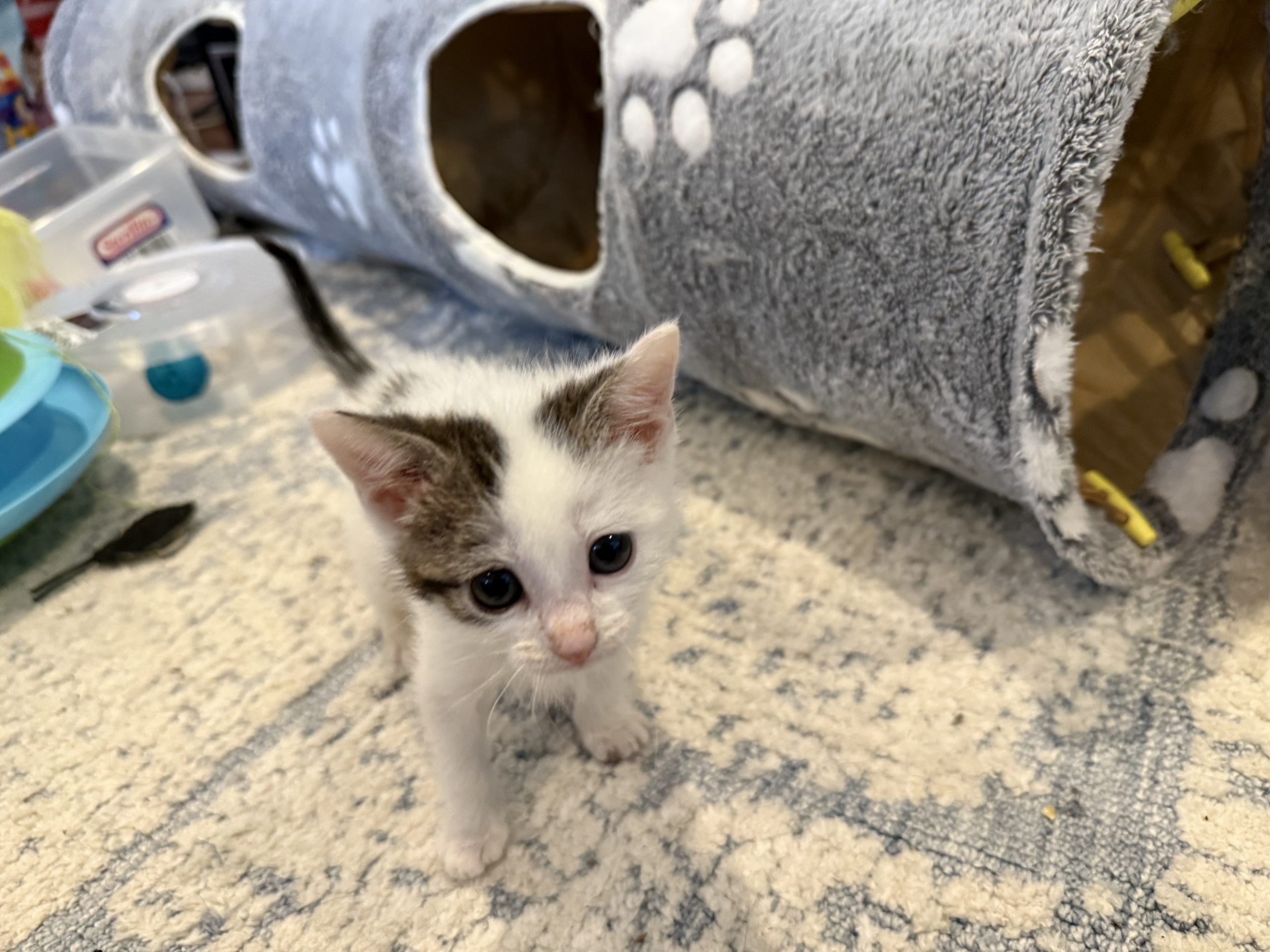 Olaf uses the litter box regularly. Olaf is less wobbly than her sister, and can do most things on her own. She currently eats Royal Canin Mother/Baby Wet food, as she is still in the process of becoming the big girl that she is! Olaf loves to play with Jingle bell balls, and she LOVES to crawl through the crinkle tunnels in her foster placement. Olaf also has a puppy bestie - Jerry! They spend a lot of time together and he tends to her grooming needs regularly.